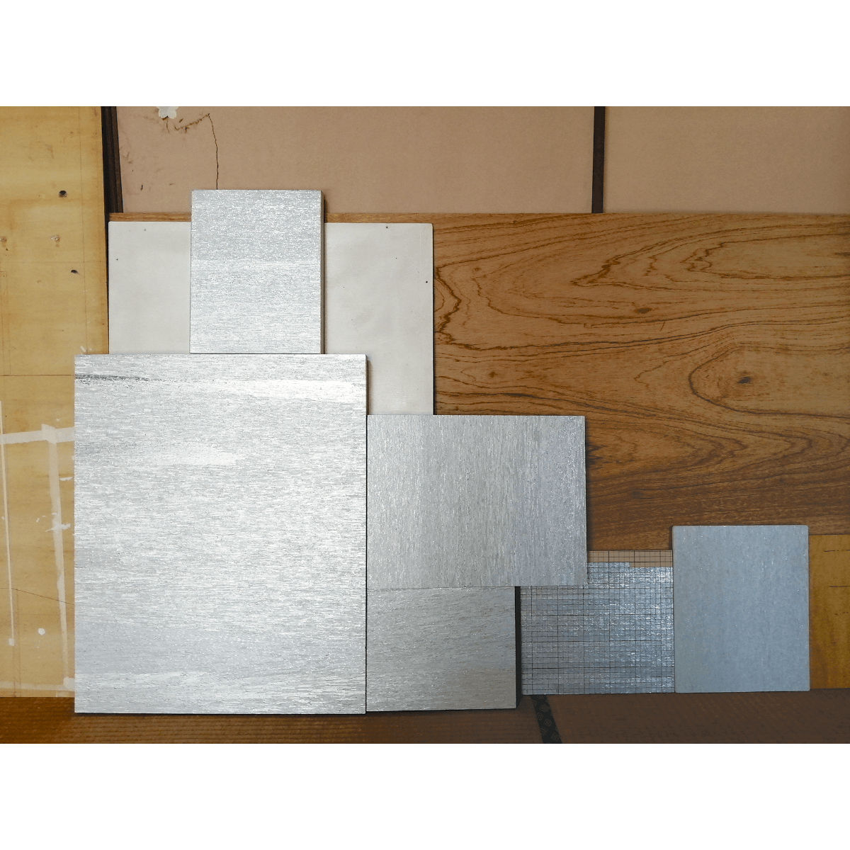 かつて日本画を学んでいたが現在、絵は描いていない。もちろん描くことは好きなのだが、素材の道理に自分を時間を合わせなければならない、単にそれを楽しめるタイプではなかったからだ。以来、菓子の包み紙や服のタグ、人から貰ったメモであったり、街中で拾った紙くず……専門的な“遠くにあるもの”ではなく、身の回りで見つかる“近しいもの”を素材にしてきた。道具にしても、キャンバスの木枠を彫り込んだ 〈飾り〉も彫刻刀ではなく極普通のカッターで削り出しているそうだ。