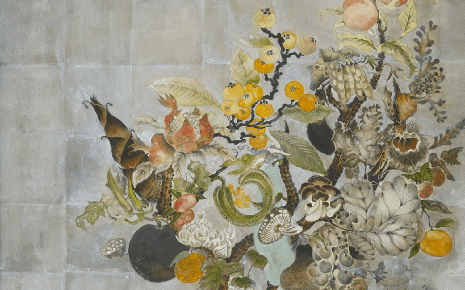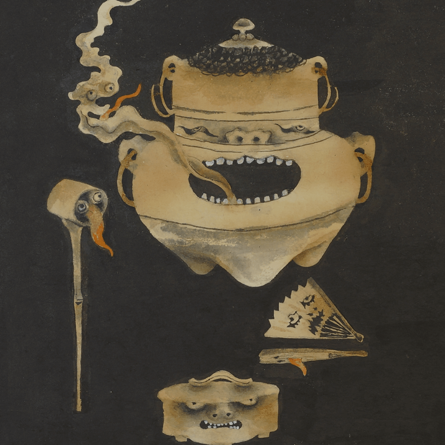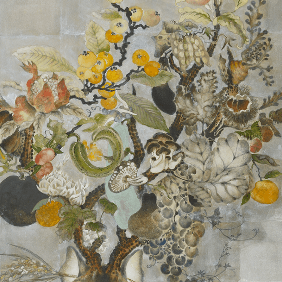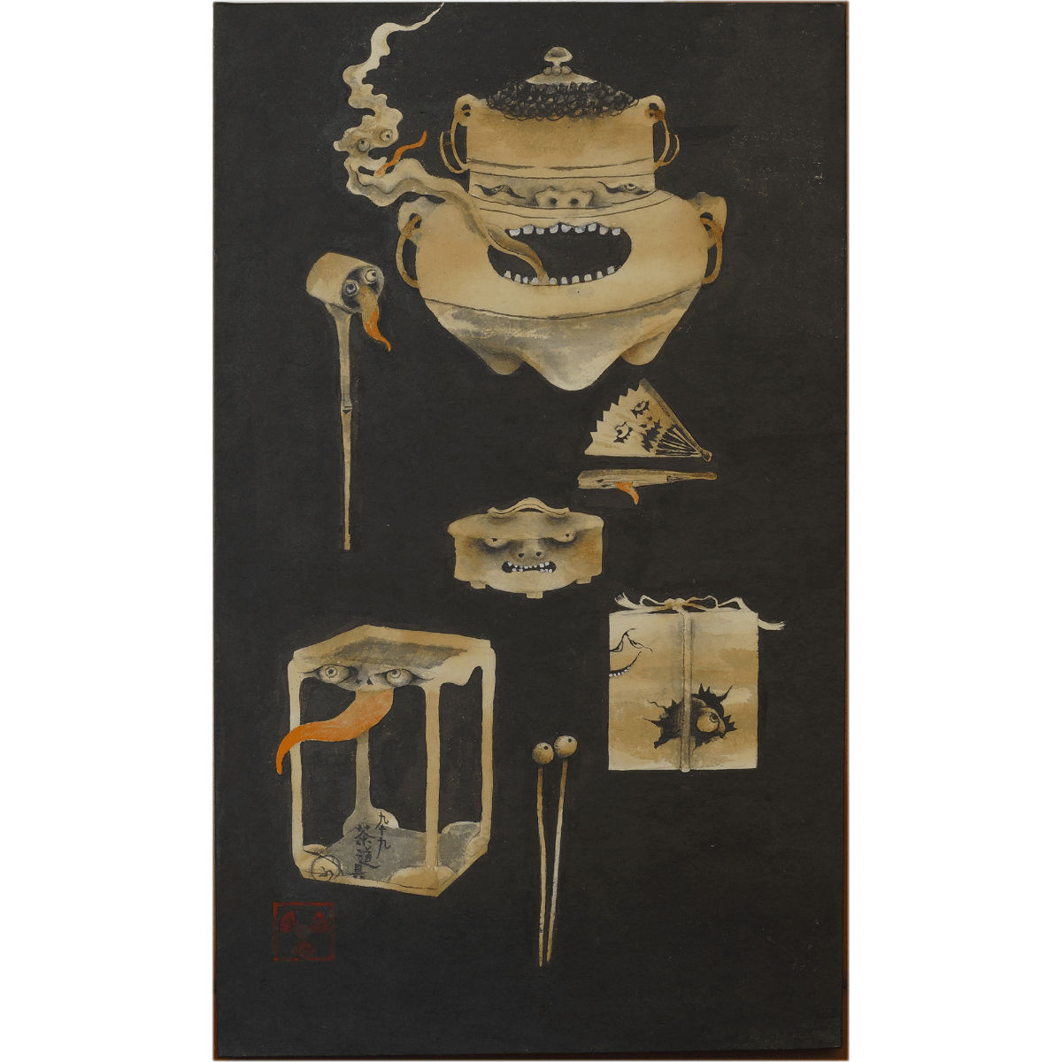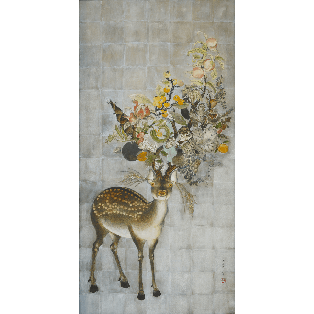 鹿と化身した神々は荘厳で超自然的な佇まいでそこに在る。長い歳月を経て付喪神となった道具たちがゆらり現れ、果物からは臓腑がどろりと零れる。菓子と動物のキマイラを生み出す傍ら、猫にそうするように様々ないきものに鈴をつけて愛玩する。物の怪であり、魍、魎、精、フランソワが描くそれらは恐ろしいだけでなく、どこか剽軽で滑稽さを纏い、またグロテスクな己の姿を静かに微笑みながら曝す。